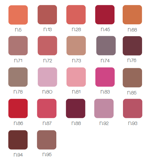| Colore | n° 5, n° 6, n° 13, n° 18, n° 19, n° 24, n° 28, n° 30, n° 31, n° 32, n° 33, n° 35, n° 39, n° 49, n° 68, n° 70, n° 71, n° 72, n° 73, n° 74, n° 75, n° 76, n° 77, n° 78, n° 79, n° 80, n° 82, n° 84, n° 85, n° 86, n° 87, n° 88, n° 89, n° 90, n° 91, n° 92, n° 93, n° 94, n° 95 |